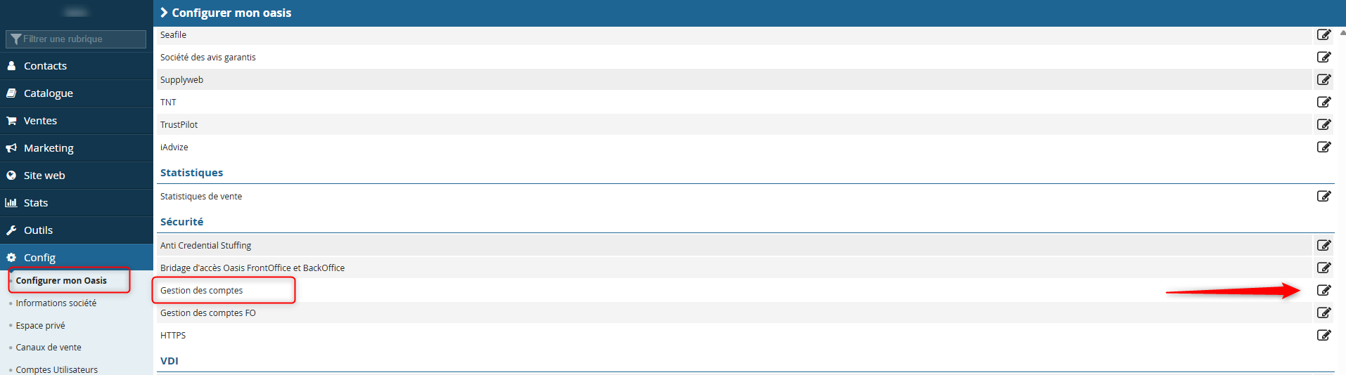 Vous avez accès à la rubrique « Sécurité » pour accéder au paramétrage « Gestion des comptes ».