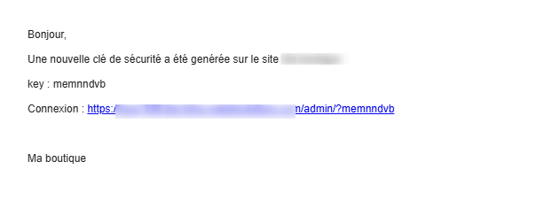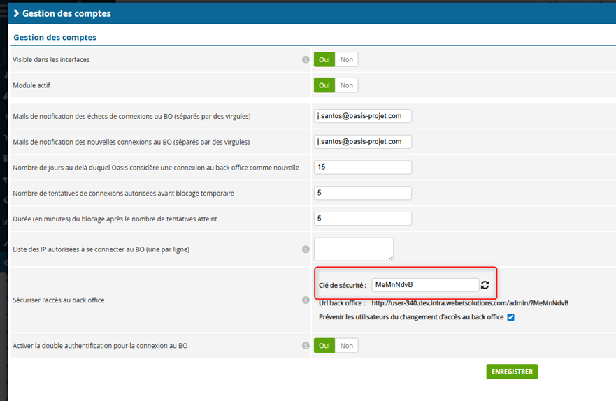 Vous pouvez indiquer une clé de sécurité en saisissant une chaine de caractères. Cette chaine viendra s'ajouter à l'url standard de connexion. Vous pouvez en générer une automatiquement.