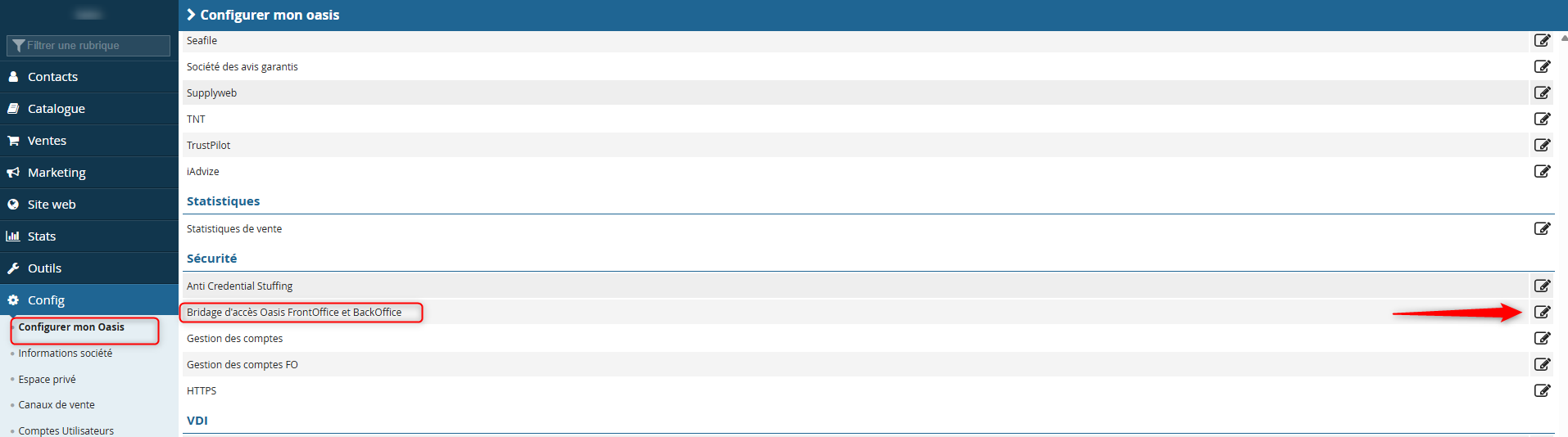 Vous avez accès à la rubrique « Sécurité » pour accéder au paramétrage « Bridage d'accès Oasis FrontOffice et BackOffice ».